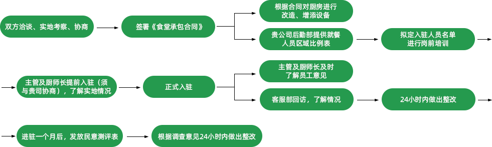 ●厂方提供食堂工作人员的宿舍,就职的员工必须遵守双方公司制度,食堂工作人员的工资,工衣、培训工作由我方负责。
